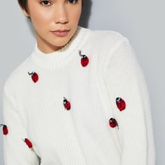Bring a little fun to your style this winter with this sweater. The adorable ladybug motifs in a cosy crochet design add a whimsical touch. It features a mock neck, full sleeves, and ribbed trim.