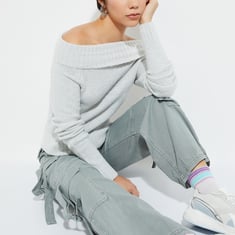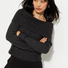 Level up your chill vibes with this knitted sweater. With full sleeves and an edgy off-shoulder design, it’s the perfect piece to rock for a laid-back yet stylish look.