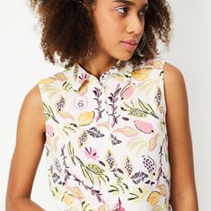 Merge your style with the comfort and elegance of this casual shirt to upgrade your wardrobe. It flaunts a printed surface, sleeveless construction, a curved hemline, and a spread collar. Team this shirt with a pair of jeans and lace-up shoes to complete the outfit.