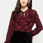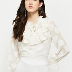 Designed with ruffled detailing and polka dots, this top features a tie-up neckline with frill accents and long sleeves. Team up this top with a pair of wide-leg trousers and high-heel sandals to complete the look.