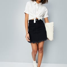 Crafted in a boxy profile, this cotton linen blend shirt will work for any occasion. It is rendered in a solid tone with a spread collar, short sleeves, a button front, and a crop-length silhouette. For a summer-chic look, pair this shirt with a denim skirt and sneakers.