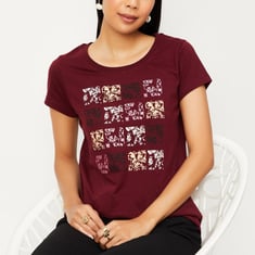 Add some style to your everyday wardrobe with this trendy t-shirt. Featuring a graphic print, it has a classic round neck and half sleeves. Pair it with jeans and sneakers to create a standout look.