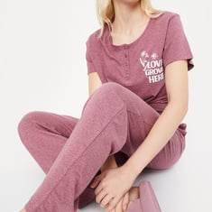 Relax and chill with this printed sleepwear set. It includes a printed T-shirt with a round neck with buttons and half sleeves along with a pair of matching solid pyjamas with an elasticated waist and drawstring.