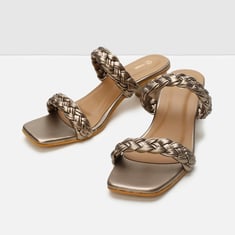Give your look a classy twist with this pair of block heels. It flaunts an open-toe construction, textured surface, 2 straps, and an easy slip-on fastening.