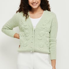 Cosy up your outfit with this floral detailed cardigan featuring a V-neckline, pearl button front, long sleeves, and ribbed trim. Pair this cardigan with a T-shirt and a pair of trousers for a casual day look.