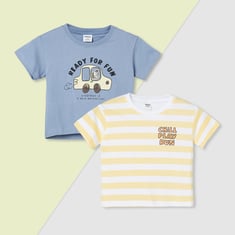Add a playful touch to your kids’ wardrobe with these assorted T-shirts, featuring one graphic print tee and one striped tee. Designed with a classic crew neck and half sleeves, this duo blends casual comfort with cheerful style perfect for school, playtime, or everyday wear.