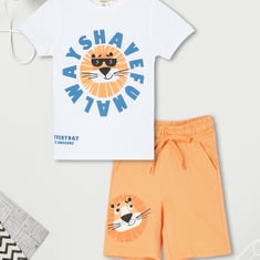 Your little one will look adorable and feel comfy in this set. It features a graphic T-shirt with a crew neck and half sleeves, paired with shorts that have a drawstring waist, side pockets, and a playful print above the hem.