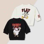 This pack of two printed sweatshirts features crew necklines, full sleeves, and ribbed hems for a snug, comfy fit. One showcases a Mickey Mouse print with a chenille-embroidered detail, while the other features a fun, printed look.