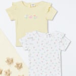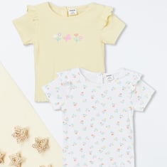 Sweet florals meet playful details in this charming pack of two ribbed tops. Designed with a round neck, half sleeves, delicate ruffles on the shoulders, and trendy lettuce-edge hems, they bring a stylish twist to everyday wear. The set includes one top with a pretty chest floral print and another with all-over floral prints, making it perfect for effortless mix-and-match looks.