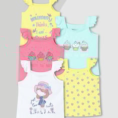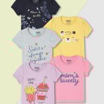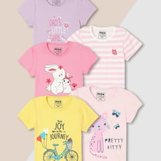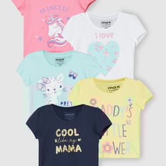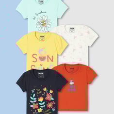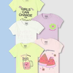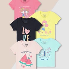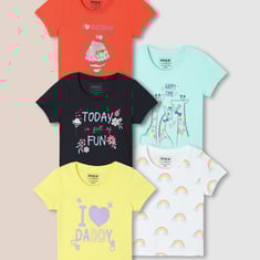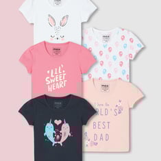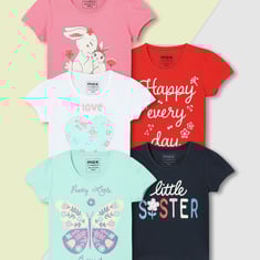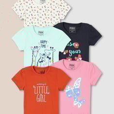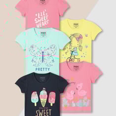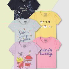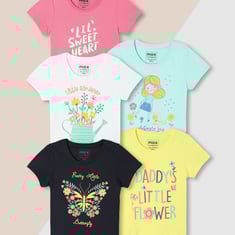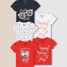 Spruce up her casual wardrobe with this set of T-shirts. It includes five tees with assorted graphic prints and colours, each featuring a round neck and half sleeves.