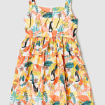Transport her to tropical paradise with this dress. The mixed prints give a vibrant flair. This dress is fashioned with a square neck, sleeveless construction, gathered waist with a ruffled overlay, and an A-line profile.