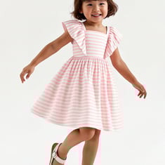 Add a playful touch to your wardrobe with this striped dress. Designed with a square neck, sleeveless silhouette, button closure, and delicate ruffles on the surface for added flair.