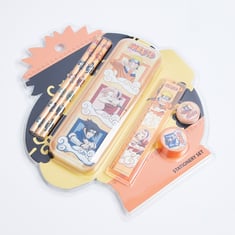 Brighten up your study time with this stationery set featuring a Naruto print pencil box. The set includes 3 pencils, 1 eraser, 1 sharpener, and 1 scale, all designed with vibrant, fun details.