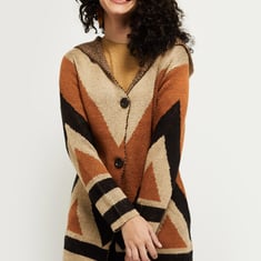 An ideal pick for a winter wardrobe, this colourblocked sweater is designed with full sleeves, button closures, side pockets, and a hood.