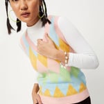 Breeze through the winter in style. This sweater has an Argyle design, V-neck, sleeveless profile, and ribbed trim.