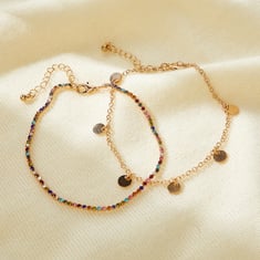 Make a dainty statement with this pack of anklets. It includes a stone embellished anklet and a chain anklet with disc charms. These anklets come with a lobster clasp.