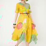 Illuminate your summer wardrobe with this vibrant printed dress. Featuring a round neck, chic short sleeves, a belted waist, convenient side pockets, and an asymmetrical hemline, it exudes both style and charm.