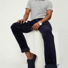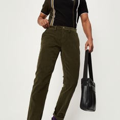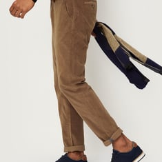 Tailor your look with this pair of chinos crafted in a skinny fit profile with a corduroy textured surface. It is styled with a flat front, belt loop waist, side pockets, and buttoned welt pockets at the back. Gear for your weekend by tucking in a sweater into these chinos and team it up with casual lace-ups.