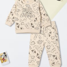This printed jogger set for boys includes a full-sleeve T-shirt with a crew neckline and ribbed hem, paired with matching joggers featuring an elasticated waist and drawstring. The coordinated design combines comfort with a sporty, everyday look.
