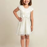 Make a charming statement in this embroidered flared dress, featuring a round neck, cap sleeves, and a delicate bow appliqué at the waist. Finished with a zip closure for a secure fit, it's a perfect blend of elegance and playful detail—ideal for special occasions or dressy days out.