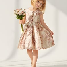This floral embellished A-line dress features a round neck, half sleeves, and delicate buttons for a charming finish. A back belt adds shape to the silhouette, making it both elegant and comfortable.
