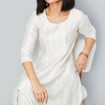 Elevate your ethnic wear with this embroidered kurti set. The kurti features intricate embroidery with embellishments on the yoke, a round neck and 3/4th sleeves. The side slits add a modern touch, while the solid trousers with an elasticated waist and a lace trim ensure comfort and style all day long.