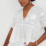 Make an elegant statement in this top, adorned with exquisite embroidered detailing. It features a V-neck with a scalloped hem, extended sleeves, a gathered waist, and a peplum hem, blending sophistication with timeless charm.