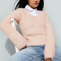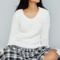 Add a touch of sparkle to your winter wardrobe with this embellished sweater, featuring a round neck and full sleeves. Soft, cosy, and stylish, it brings a hint of elegance to your everyday look.