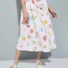 Add a playful swing to your step with this printed flared midi skirt, designed with a comfortable button closure and a flowy silhouette that moves with you. The vibrant print brings effortless charm to any look.
