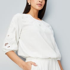 Add a touch of charm to your wardrobe with this embroidered blouse, featuring delicate detailing, a flattering round neck, and playful puff sleeves. Perfect for elevating everyday looks with a hint of elegance.