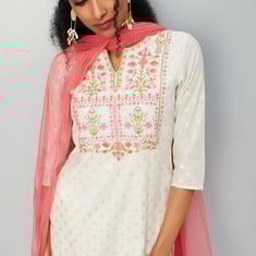 This kurta set features beautiful embroidery on the yoke, with a notched neck, three-quarter sleeves, and matching palazzos with an elasticated waistband. It also comes with a dupatta to complete the look.