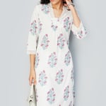 Flaunt elegance in this stunning kurta featuring a vibrant floral print and a kimono collar adorned with lace detail. With three-quarter sleeves and a convenient pocket, this calf-length silhouette beautifully blends style and functionality, making it a perfect choice for any occasion.