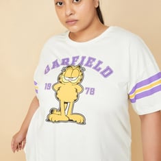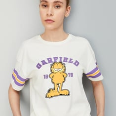 Get that relaxed yet stylish look with this T-shirt. Featuring a Garfield print, round neckline, and half sleeves.