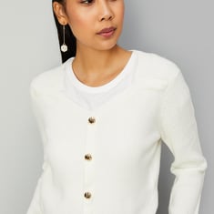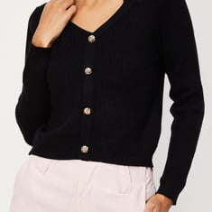 Slay through the season in this cardigan. It featured a sweetheart neckline, full sleeves, ribbed trim, and a button front closure. Layer this cardigan over a T-shirt and team it up with trousers, and a sling bag.