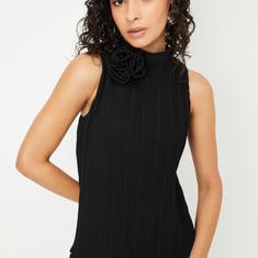 Elevate your outfit with this chic top, showcasing an elegantly high neck adorned with intricate floral appliqué for a refined touch. The sleeveless construction allows for easy layering, while the delicate lettuce hem adds a trendy finish.