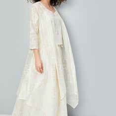 Paint a picture of elegance in this ethnic set. It includes a sleeveless top with a V-neck and floral embroidery. The printed maxi skirt has a tie-up at the side and a longline shrug with a front open, three-quarter sleeves, and an asymmetric hem.