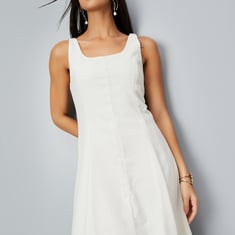 Make a sleek statement in this panelled A-line midi dress, designed to flatter with clean lines and timeless elegance. Featuring a square neckline and sleeveless silhouette, it offers a structured yet feminine look. The midi length adds sophistication, while the zip closure ensures a seamless fit.