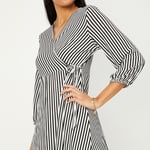 Looking to add an elegant twist to your wardrobe this summer? How about trying out this stunning wrap dress? Featuring beautiful striped pattern, a surplice neckline, 3/4th sleeves, a tie-up at the waist, and a knee-length profile. This dress is perfect for any occasion. Pair it with some stylish strappy heels to complete the chic look.