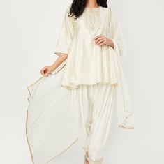 A stunning addition to your ethnic wardrobe, this kurta set is a true stunner. The A-line kurta features a woven design surface, a notched neckline with an embroidered yoke, and three-quarter sleeves. The set is completed with a pair of dhoti pants and a dupatta, perfect for making a stylish statement.