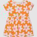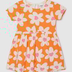 Your kid will have a happier day wearing this printed fit and flare dress. It has a bow, a round neckline, half sleeves, and a button closure.