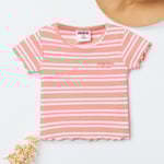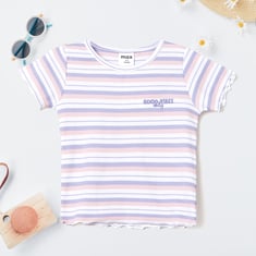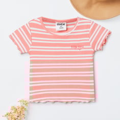 This striped ribbed top features a classic round neck and half sleeves, offering a stylish and comfortable fit with a textured finish.