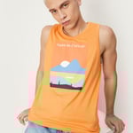 Summer calls for this vibrant T-shirt highlighted with a graphic print at the front. It features a crew neckline, sleeveless constriction, and a slim fit profile. Pair this tee with jeans and complete your ensemble with sneakers.