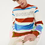 Set yourself for winter with this striped sweatshirt featuring a crew neck, full sleeves, chest print, and ribbed hem. Style it with a pair of jeans and sneakers for a trendy look.
