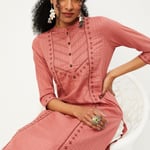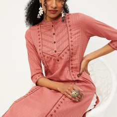 Create an effortless look with this straight kurta. It has three-quarter sleeves, pockets, a band collar with an embroidery design on the front and a button placket.