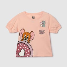 This kid's t-shirt is accentuated by a Tom and Jerry print along with a pocket, it features a round neck and puffed sleeves.