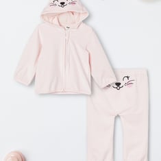 This cosy jogger set is the perfect start for winters. The sweatshirt features an applique hood with a zip closure and full sleeves, offering warmth and a trendy look. Paired with elasticated waist joggers, this set ensures a snug and comfortable fit for all-day wear.
