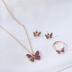 Adorn your child with this charming jewellery set, which includes a necklace featuring a butterfly-shaped pendant and a lobster closure, a pair of stud earrings with post and back closure, and an adjustable ring. Your child will look absolutely adorable wearing this delightful set.