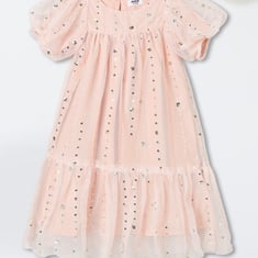Step into elegance with this embellished A-line dress, featuring puff sleeves and a flattering round neck. The button closure adds a classic touch, while the flounce hem gives it a playful, feminine finish.