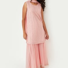 Dress her for occasions and celebrations with this ethnic set. It includes a kurta with a round neck and a sleeveless profile. The pair of sharara pants has an elasticated waist and sheer overlay. The dupatta completes the look.
