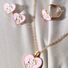 Make your little girl dazzle with this hello kitty-shaped jewellery set. It comes with a necklace, a pair of studs, and a ring.